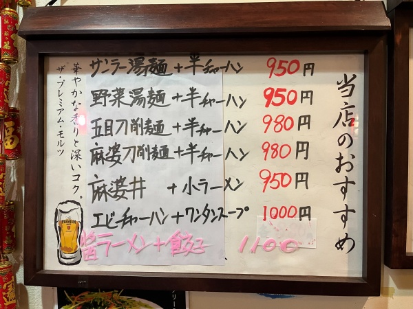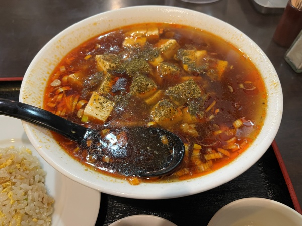 刀削麺を食べるのは久々だなぁ〜。刀削麺は好きなので丁度いいやと『麻婆刀削麺+半チャーハン(980円)』を注文。