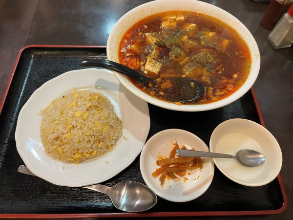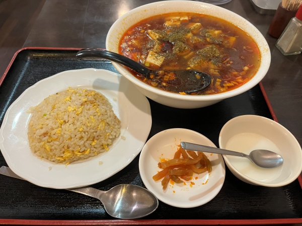 しばらくして、女将さんが麻婆刀削麺とチャーハンを持ってきてくれました。