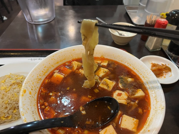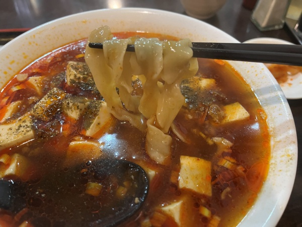 陳記さんの麻婆刀削麺はスープ(出汁)はあっさりしていますが、麺は小麦感があり食べ応えがあるのでバランスが良いです。