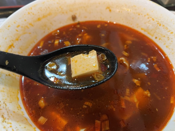 見た目は辛そうに見えますが、ヒリヒリするぐらいでそこまで辛くないです。ラー油がかかってますが、ラー油の辛さはかなりマイルドですね。ただその分、胡椒のピリピリ感は強く口の中に心地良い痺れが残ります。