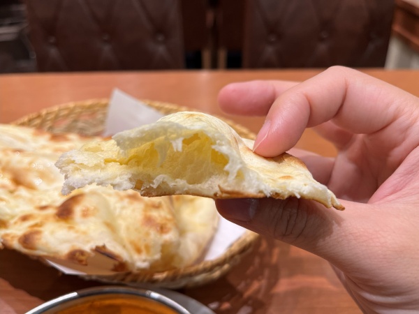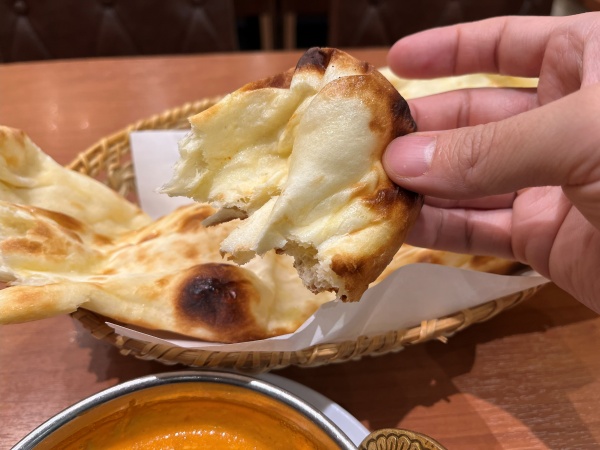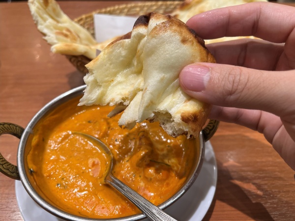 ふわっとしたパン生地と濃厚でクリーミーなバターチキンカレーを一緒に食べると満足感ありますね!