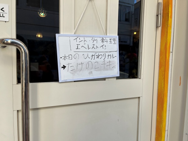 入り口のドアの所のホワイトボードには『本日の日替わりカレー』が書かれています。今日の日替わりは『たけのこチキン』ですか、、この時期にタケノコとは珍しい↓