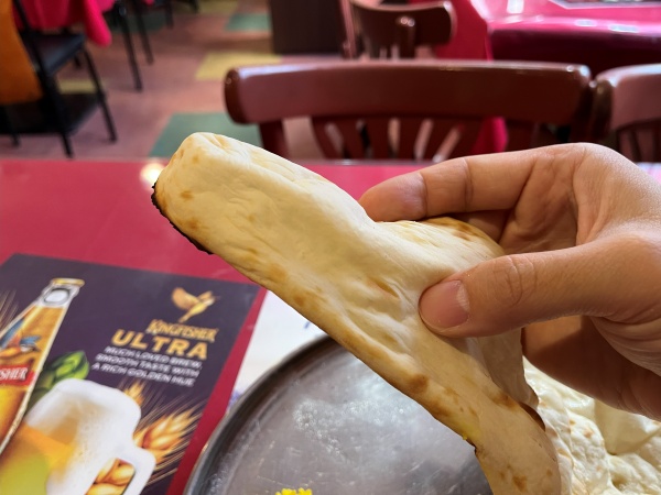結構厚めのナンでナンの縁はピザの耳ぐらいボリュームがあるのですが、食感はふわもちでシルキーな舌触りで美味しい。