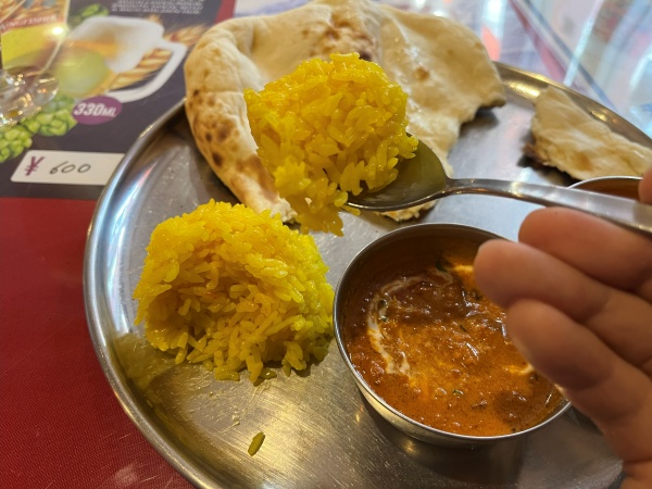 添えられているターメリックライスは、ジャポニカ米でモチモチした食感で、残り少なくなってきたカレーをライスと残りのナンで食べてフィニッシュ!