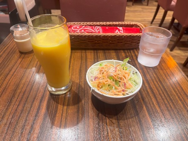 注文して数分で、サラダとマンゴーラッシーが到着。