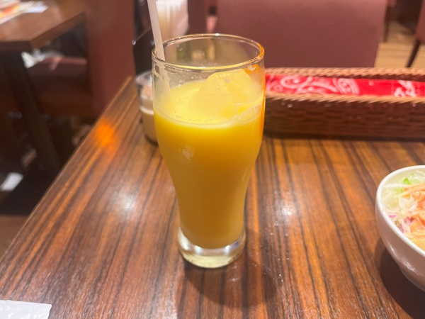 マンゴーラッシーは薄くも濃くもなく丁度良い濃度のマンゴーラッシーで、爽やかな甘さがスッと身体に染みます。