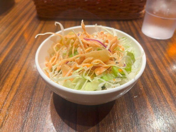 具材はキャベツ、紫キャベツ、ニンジン、レタスでドレッシングは、薄味ですが旨みが強いニンジンドレッシング?ですかね。