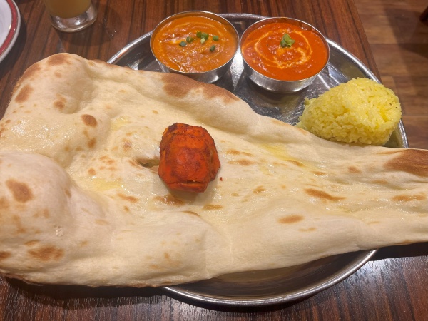 ナンがデカいぃぃ!画角に収まらないデカナンが乗っているカレーセット。