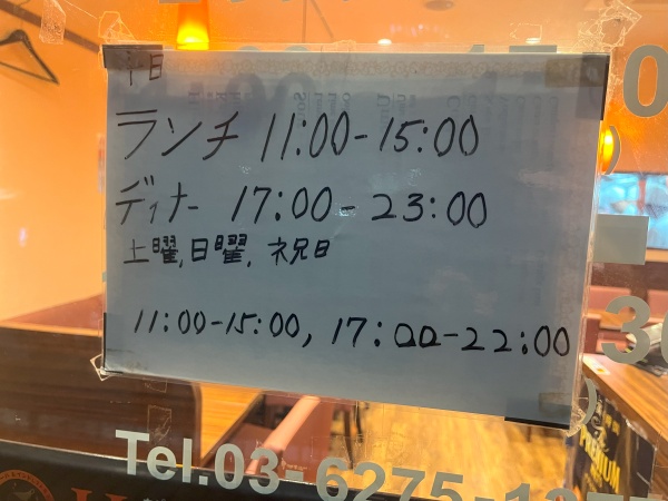 営業時間はランチタイムとディナータイムで分かれていて、平日と土日祝日ではクローズの時間が違うので注意。