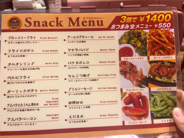 『HAPPY 田町東口店』さんのメニューラインナップですが、ディナータイムなのでカレーセットだけじゃ無くお酒のおつまみも豊富に揃ってます。