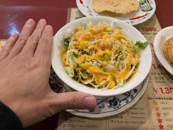 手と比べるとこんな感じでフルサイズのサラダ↑野菜をいっぱい摂取できるのは嬉しい。