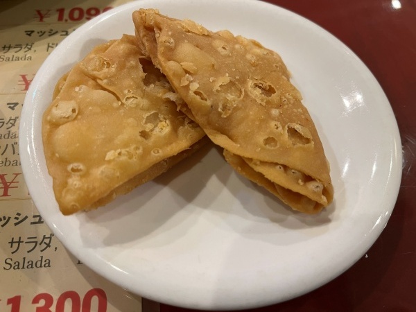 中身は細かくカットされたタンドリーチキンが入っていて、生地の密度高めで、スパイシーなアメリカンドッグという印象。