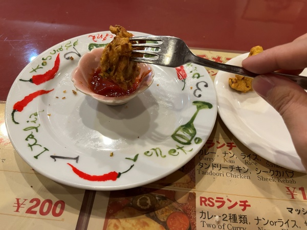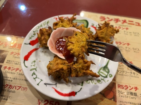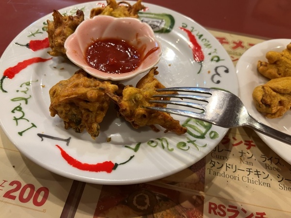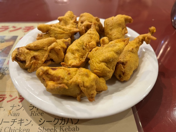 食べ終わった頃に、ラッシーとパコラ(インド風天ぷら)が到着。