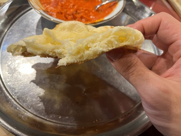このナンが、ふわふわモチモチですごく美味しいっ!!ふんわりとしていて高級食パンの様な上質な舌触りで、中心部はホットケーキの様な食感。