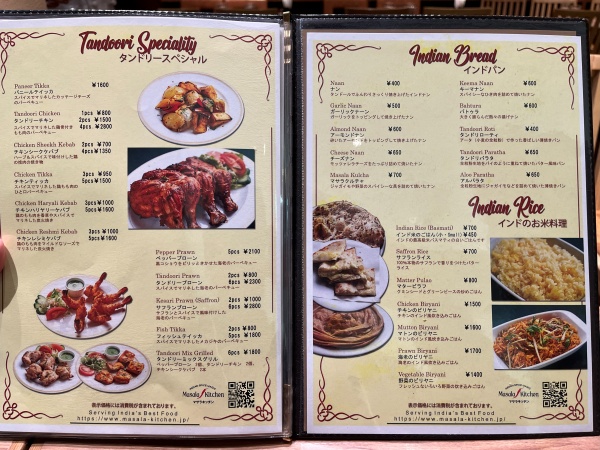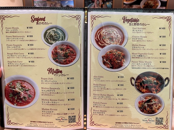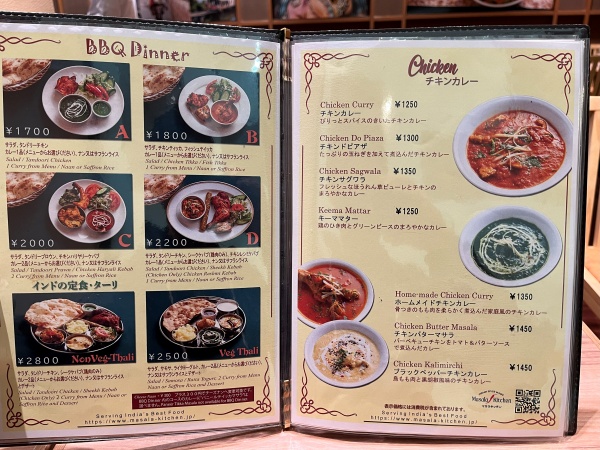 マサラキッチンさんのメニューの特徴としては、プローンマサラ、チキンドピアザ、ローガンジョシュなど、本格的なインド料理名で記載されている点です。