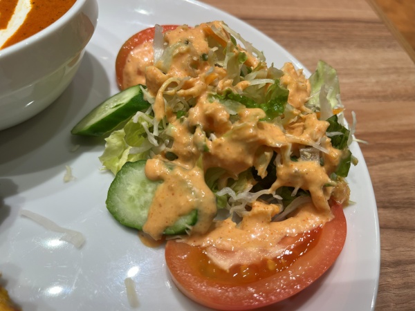 サラダの野菜はきゅうり、キャベツ、レタス、トマトで、一口食べてみると、ドレッシングが美味しい!