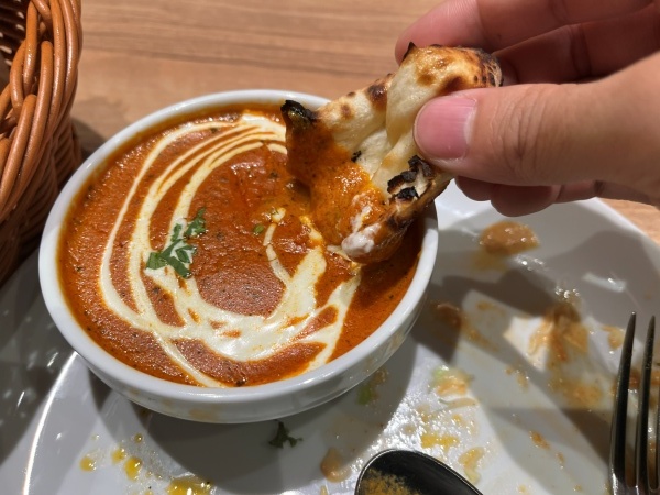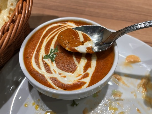 スプーンで一口飲んでみると、普通のバターチキンカレーと違う!口当たりはまろやかだけど、最後に香辛料のスパイシーな風味が抜けていきます。