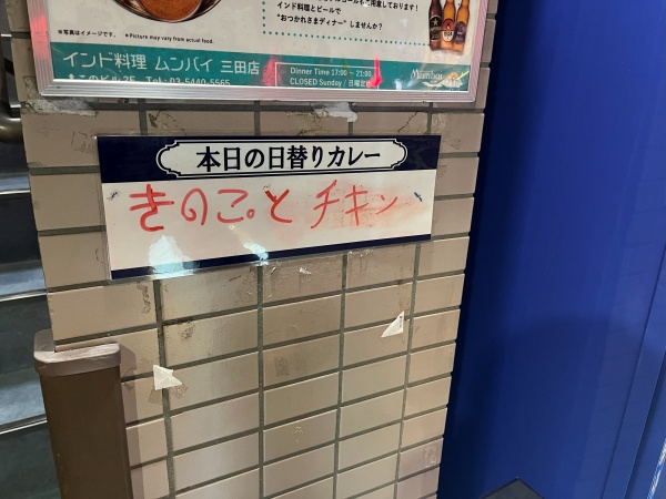 また、隣のホワイトボードには本日の日替わりカレーとして『きのことチキン』の文字が。恐らく日本語に慣れていないであろう辿々しい文字で書かれておりホッコリした気分になりました。