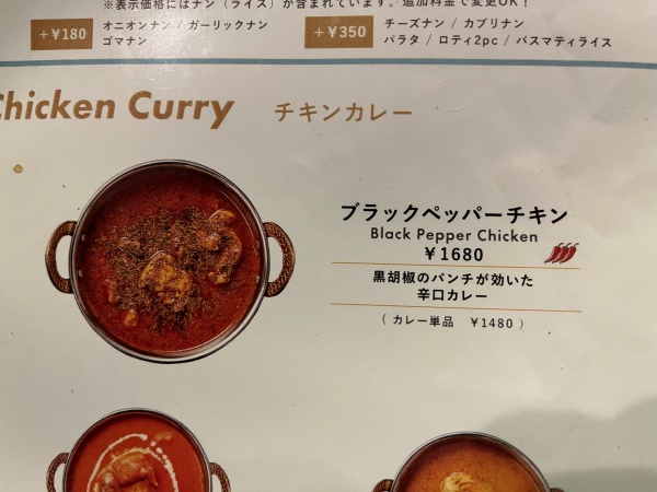 また、ブラックペッパーチキンというメニューも発見。チキンカレーに黒胡椒をかけたパンチがありそうな品で興味をそそられます。