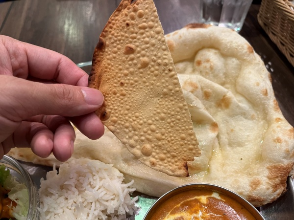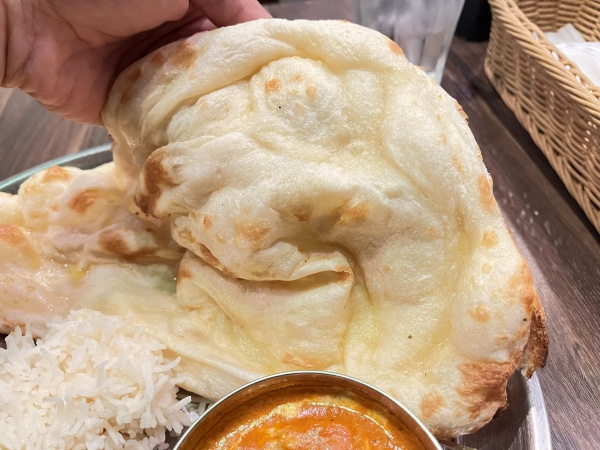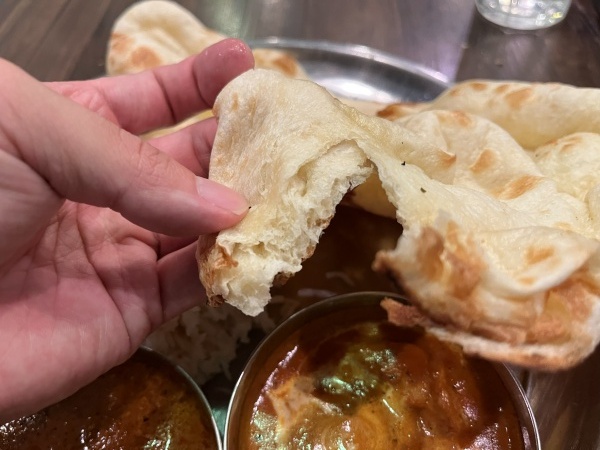 たっぷりギー?バターが塗ってあり甘く芳醇な香りがします。あったかいナンをちぎって食べてみると、もっちりした食感で美味しい!