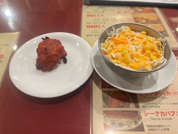 待っていると、まずは先陣でチキンティッカとサラダが到着。