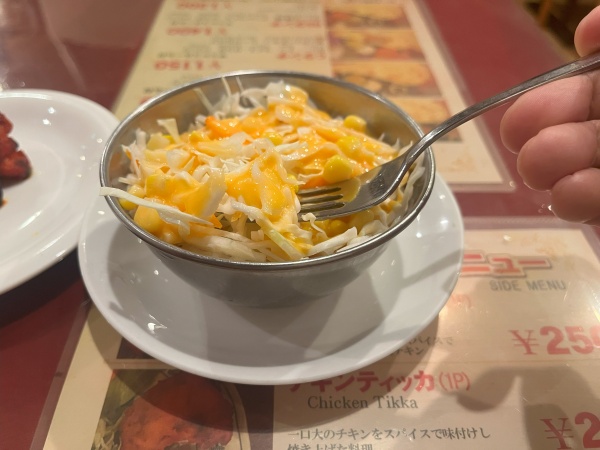 サラダはヨーグルトが入った酸味の強いドレッシングでコールスローに近い味でさっぱり爽快な味付け。