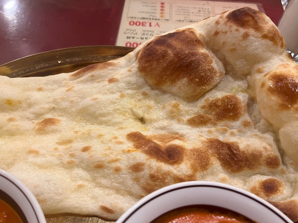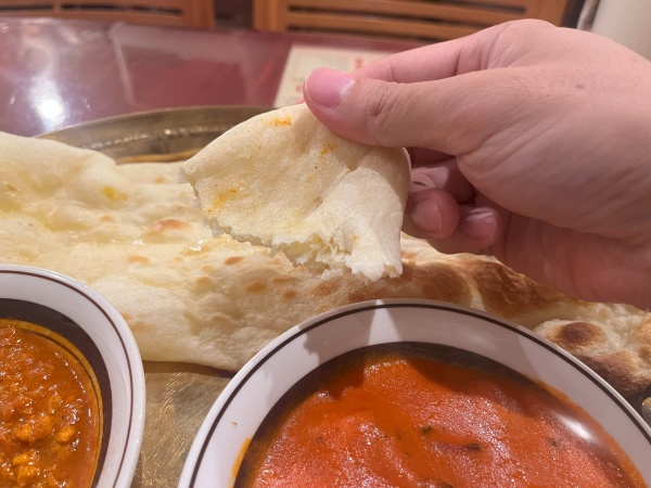 ナンは甘みを感じるナンで、フワフワというよりは表面カリッと中は密度高め。ベーグルの様な硬めの食感で、カリッと焼いたベーグル生地が好きという方は結構ハマるかも、、、。