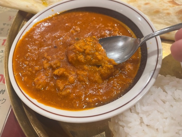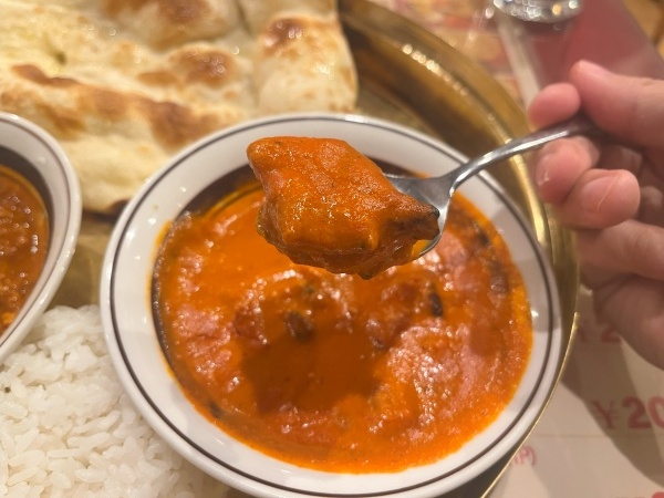 カシューナッツ感は少なめなのでクリーミーな舌触り。王道のバターチキンカレーという印象の味わいでした。