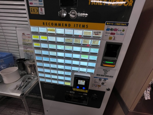 厨房の近くに券売機があり、ここで買って厨房の提供口でスタッフに渡すシステムです。