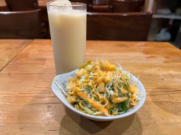 注文してすぐにサラダとマンゴーラッシーが到着。