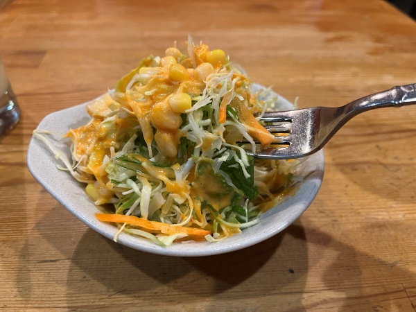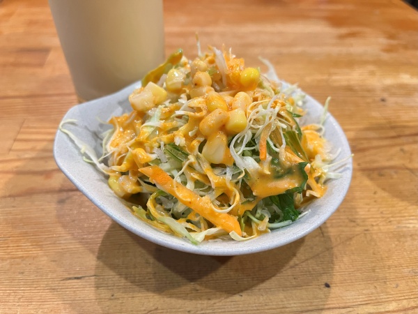 具材はニンジン、水菜、キャベツ、コーンで、食べてみるとドレッシングが結構酸味強め。