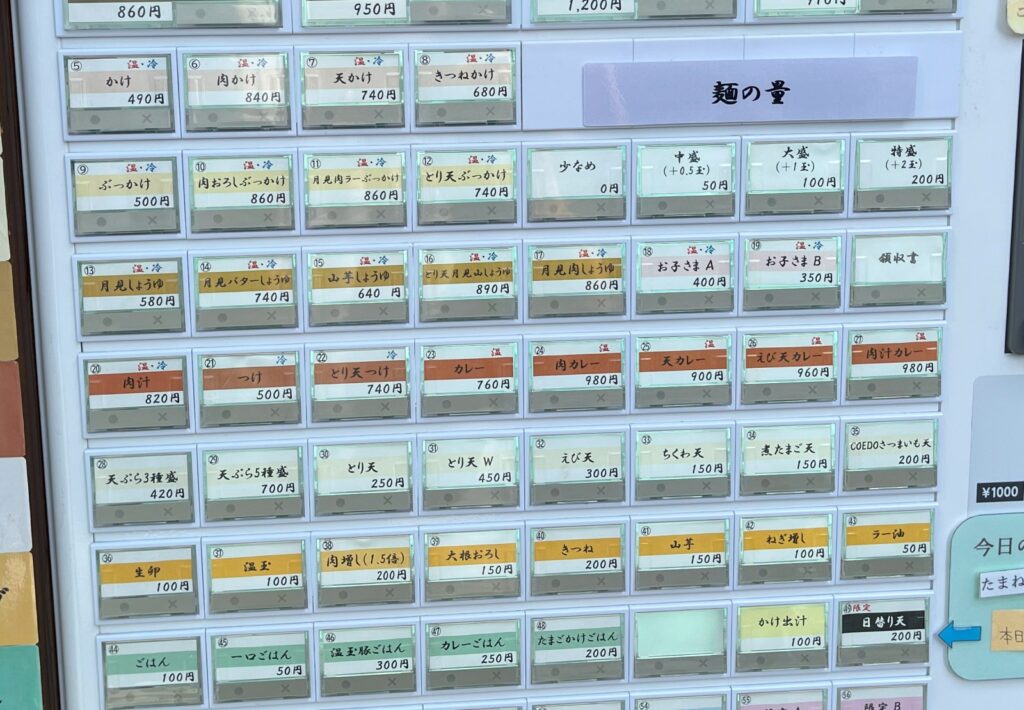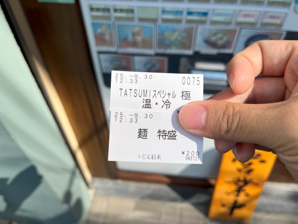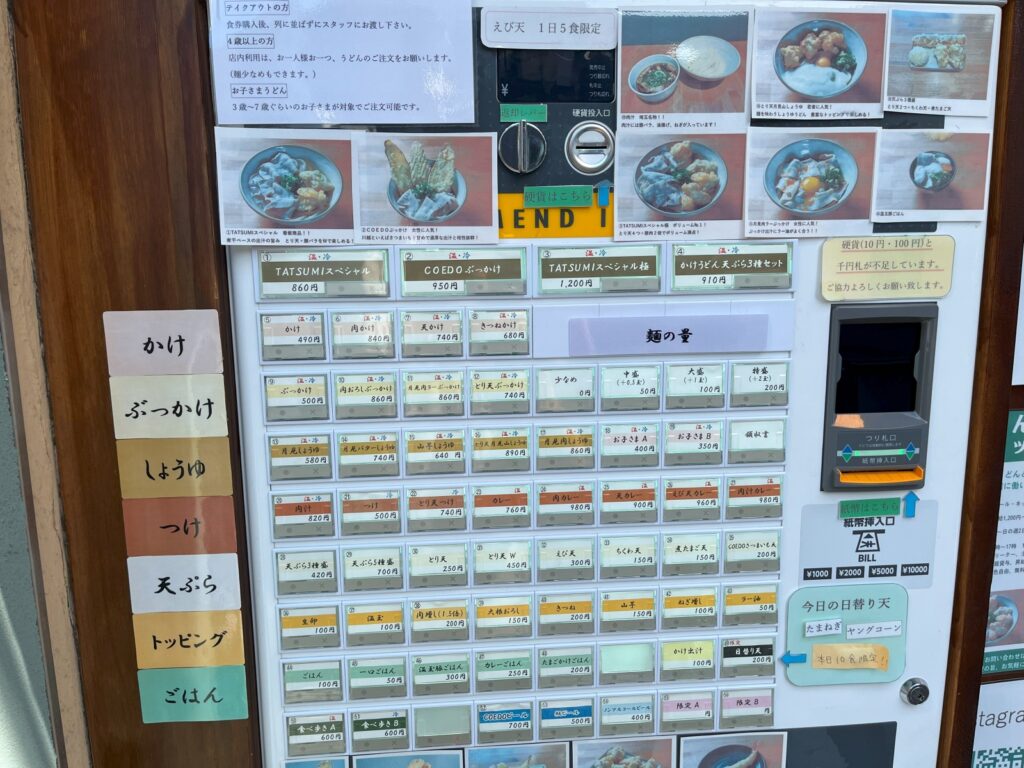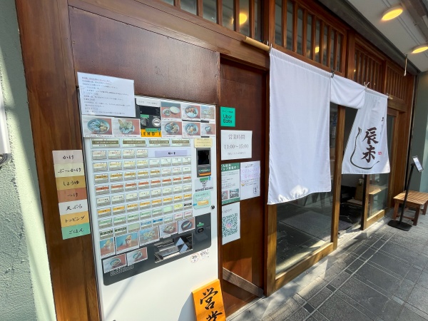 『うどん 辰未』さんですが店舗前にある券売機で食券を買ってから入店するシステム。