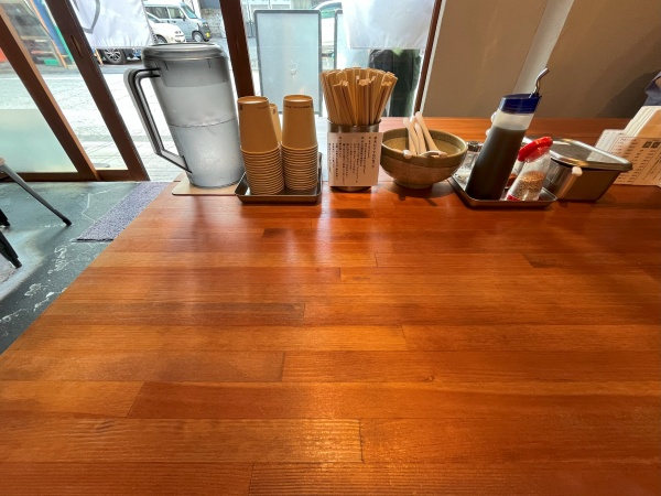 食券を店員さんに渡して入店、店内はカウンター席になっている8人掛けの立派な長机が2本中央にあり、奥にテーブル席もあります。今回は長机のカウンター席に案内していただきました。