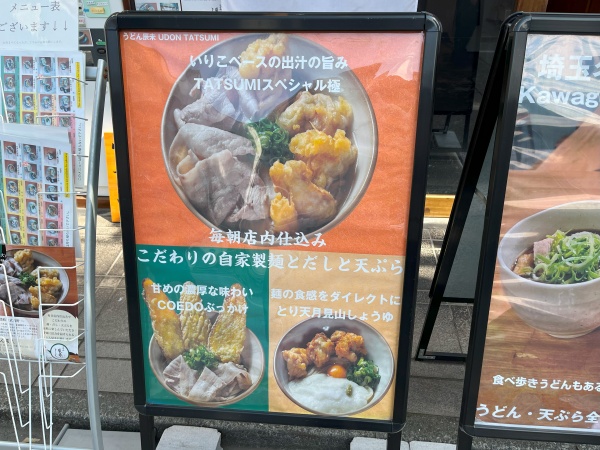 『オススメは店名が入った「TATSUMIスペシャル」と大きなお芋の天ぷらが入った「COEDOぶっかけ」です』との事。