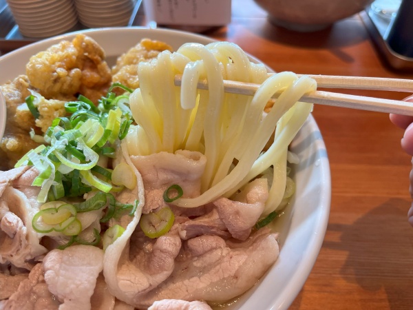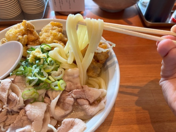 箸で持ち上げると、ゴワゴワ感はなく滑らかで艶感があり讃岐っぽい見た目ですね。