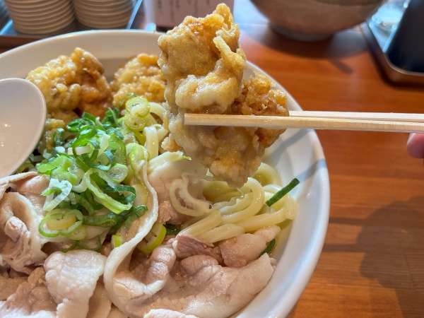 ホロホロ崩れるぐらい鶏肉が柔らかく、また、鶏胸肉が使われているかしわ天と違い、鶏もも肉なので脂身も多くプリプリジューシーで満足感高いです。
