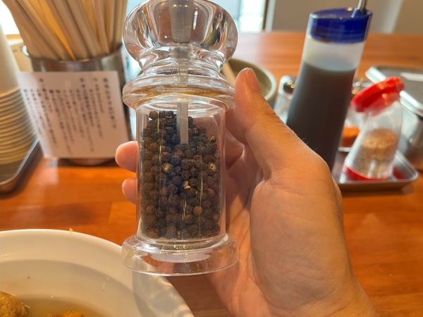 最後は、卓上の胡椒、ゴマ、唐辛子、天かすを入れて食べました。